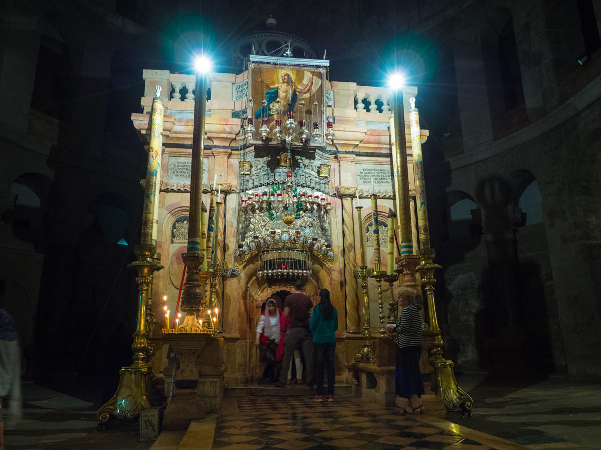 No i nieopodal trzecie najświętsze miejsce – tym razem dla chrześcijan, o które chrześcijanie różnych odłamów toczą boje: Bazylika Grobu Pańskiego, gdzie najmniej odczuwało się to skupienie. To był, niestety, jarmark, bazar. Denerwowało to, że ludzie tam jedli, rozmawiali, nudzili się czekając po kilka godzin w kolejce do Grobu Pańskiego. I to było rzeczywiście miejsce, które nie napawało spokojem duchowym. Nie po to się przychodzi do świątyni. Trochę uciekając z tego miejsca znalazłyśmy taką bardziej współczesną kapliczkę, gdzie siedziało dwóch franciszkanów i pan w historycznych szatach – ubrany jak Jezus, na boso, długie włosy – czytał Biblię. Usiadłyśmy tam sobie, ale później zostałyśmy z tego miejsca niejako wyrzucone. Poczułam bunt, bo to było jedyne miejsce, gdzie panuje spokój, a nie pozwalają nam tu siedzieć. Okazało się, że ochroniarz wplótł nas w drogę krzyżową prowadzoną przez franciszkanów. Było chyba sześciu zakonników i kilkoro wiernych, w tym my dwie. Dostałyśmy świeczki i śpiewniki po łacinie, cała reszta turystów – nie pielgrzymów – została odgrodzona, a my dostałyśmy się do tych wszystkich miejsc, które w tej świątyni są zamknięte: Golgoty, Kamienia Namaszczenia i Grobu Pańskiego. I to było niesamowite przeżycie. To już było wyciszające.